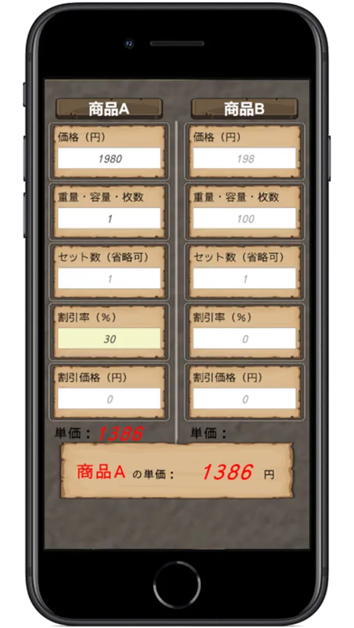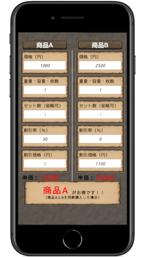 アプリの画面左半分に商品Aの情報を入力し、右半分に