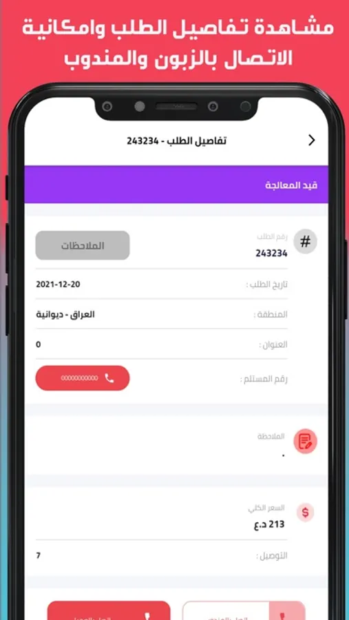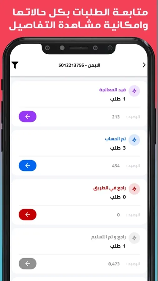 يمكنك متابعة الطلبات الخاصة بك من خلال التسجيل في التطبيق وبعدها فتح المستخدم وادخال رمز العميل الخاص بك لمتابعة كل الوصولات بكل حالاتها وامكانية السائق بالتحكم بحالة الطلبات و البحث والاستعلام عن الحالة للوصل مع نظام اشعارات عام لايصال حالة الطلب الى العميل