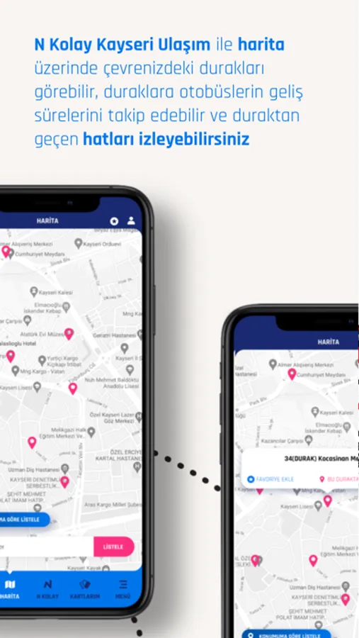 N Kolay Kayseri Ulaşım ile harita üzerinde çevrenizdeki durakları görebilir, duraklara otobüslerin ne kadar süre sonra geleceğini takip edebilir ve duraktan geçen hatları izleyebilirsiniz. Durakları, hatları veya istediğiniz herhangi bir noktayı favorilerinize ekleyebilir, otobüslerin geliş saatleri ile ilgili alarm kurabilir ve otobüs istediğiniz durağa yaklaşmadan önce bildirim alabilirsiniz.