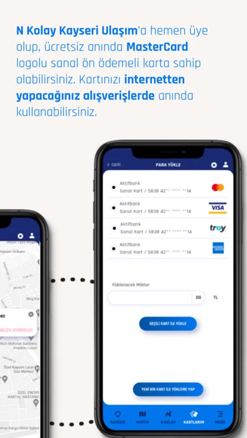 N Kolay Kayseri Ulaşım’a hemen üye olup, ücretsiz anında MasterCard logolu sanal ön ödemeli karta sahip olabilirsiniz. Kartınıza yapacağınız para yükleme işlemleriniz sonrasında kartınızı internetten yapacağınız alışverişlerde anında kullanabilirsiniz.