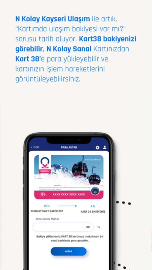 N Kolay Kayseri Ulaşım ile artık, “Kartımda ulaşım bakiyesi var mı?” sorusu tarih oluyor. Kart38 bakiyenizi görebilir, N Kolay Sanal Kartınızdan Kart 38’e para yükleyebilir ve kartınızın işlem hareketlerini görüntüleyebilirsiniz.