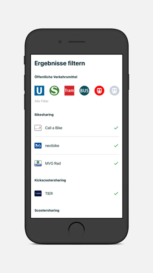 • Multimodal: Die Auskunft umfasst die Sharing-Angebote von ShareNow, Miles, TIER, Call a Bike, nextbike, MVG Rad München