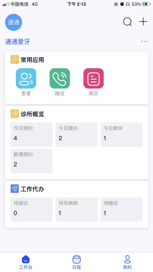 【今日工作】 集中显示今日工作的主要内容,当日就诊、待收费、已收费、待提醒、待随访等,方便快捷进行工作内容导航