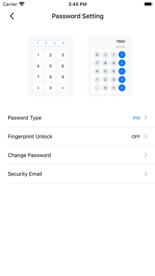 - Calculator, Pin, Password, Pattern & Touch/Face ID.