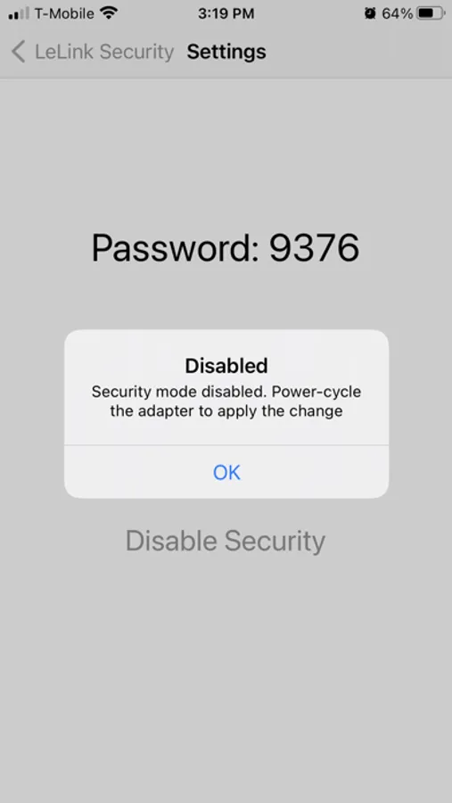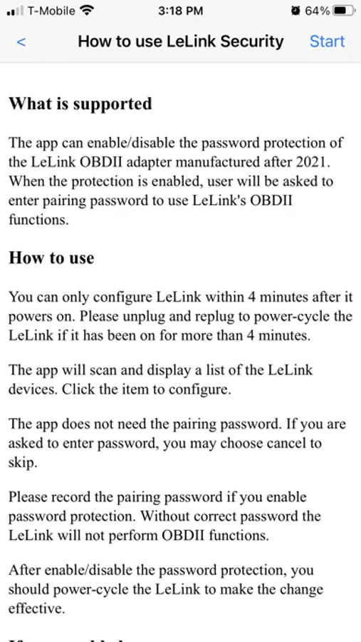 Please record the pairing password if you enable password protection. Without correct password the LeLink will not perform OBDII functions.