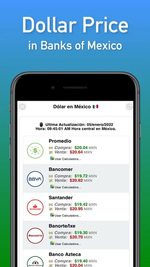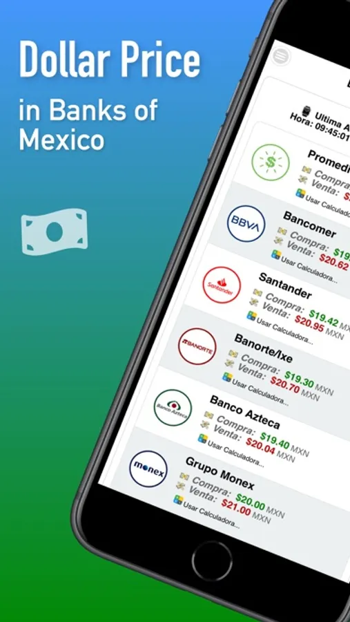 Dollar in Mexico - This application shows the price of dollar, to buy and sell in the following banks in Mexico: Banamex, Santander, Monex, Banjercito, Bank of Mexico, HSBC, Banorte, BXPlus, Azteca Bank, Inbursa, Scotiabank, Bajio Bank, Bancomer, Ixe, Banregio.