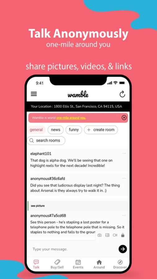 Talk to people around you. Create chat rooms for different topics and chat anonymously. Share pictures and videos on chat.