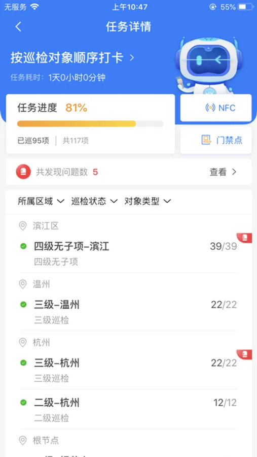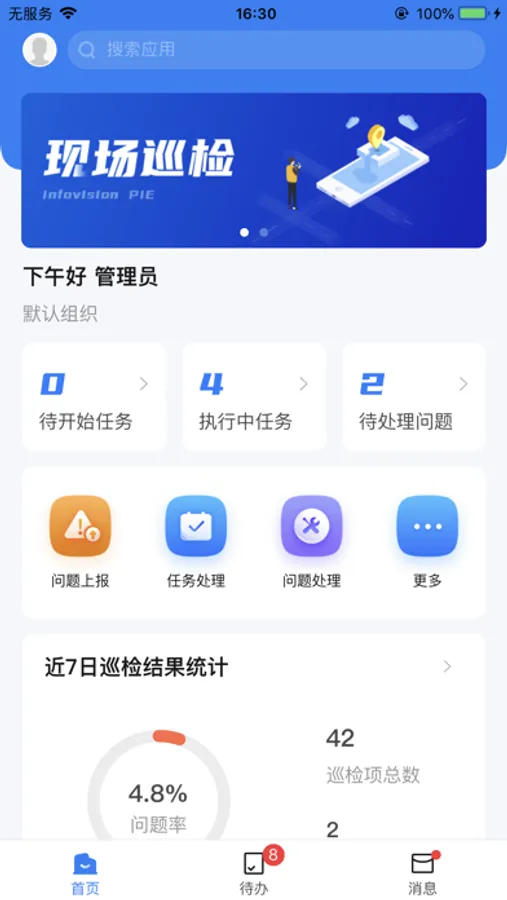 现场巡检是一款集成了问题上报、任务处理、问题处理、标签绑定、统计、任务记录和问题记录功能的App,方便了巡检人员巡检过程中发现的问题进行管理和跟进。