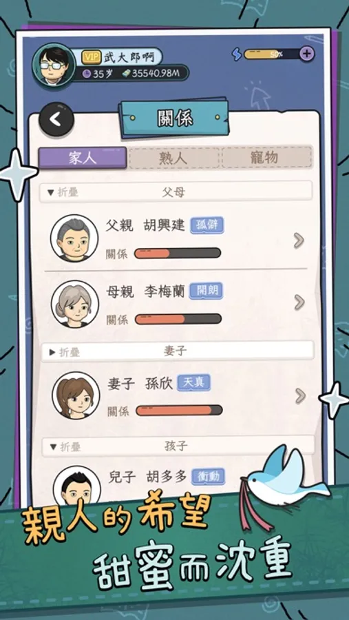 正如現實的人生一樣,你可以將主角的人生目標定為還完房貸,也可以定為讓一家人衣食無憂,也可以是成為人脈之王、登上財富榜單等等。自由規劃你失業後的人生,讓他成為一個精彩故事的開始吧!