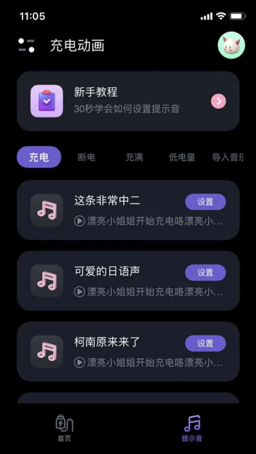 充电提示音(提莫队长正在充电),低电量提醒(救救我救救我,再不充电我就没了),充满电提醒(呼,终于吃饱了~),超多种类的充电提示音可供挑选,海绵宝宝,名侦探柯南,哥特萝莉等等……总有一款会直击你的灵魂。
