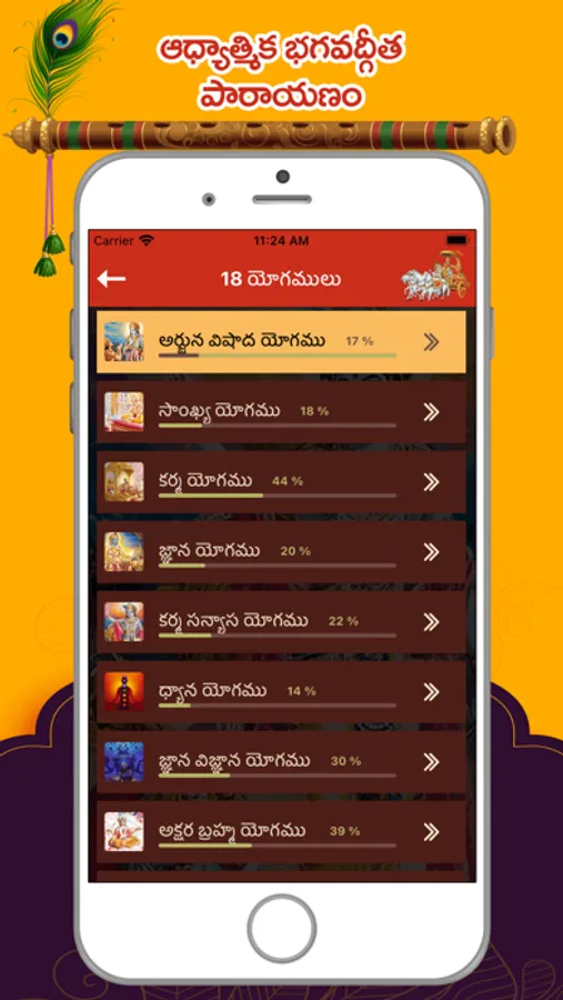 ArjunaVishada, Sankhya, Karma, Jnana, Karma Sanyasa, Akshara Bhramaha, Raja Vidhya, Vibhooti, Vishvaroopadarshana, Bhakti, KshetraKshetraVibhagaYoga,