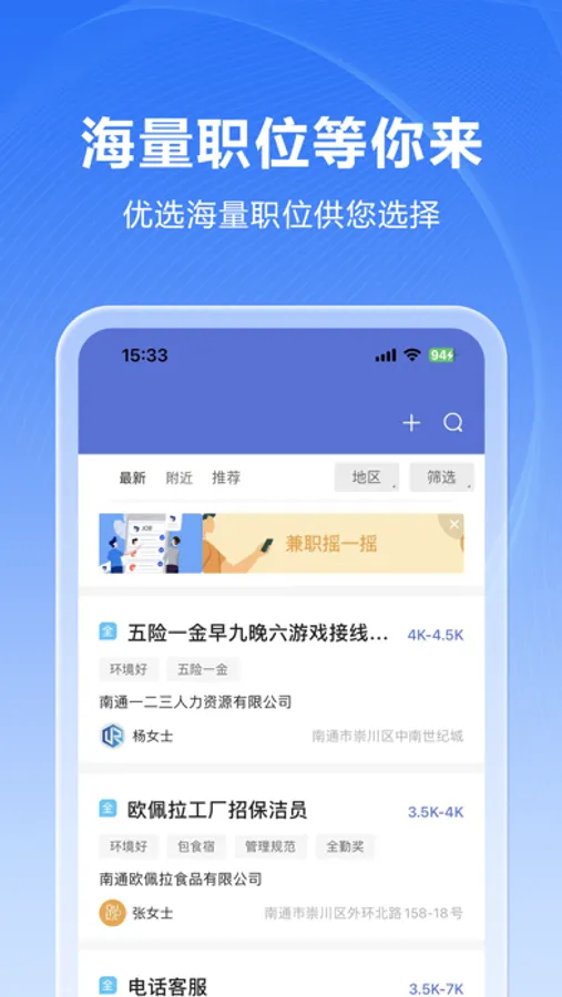 “在线选择委托推荐,根据您的简历情况,伯乐给您精准推荐工资高、离家近、口碑好、稳定、福利待遇齐全的工作,无任何费用,让您找工作更快更靠谱,随时随地帮您找到心仪的工作,各行业各岗位应有尽有”
