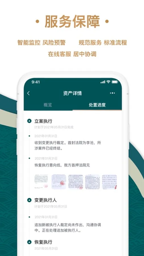 专业客服全程对接,对律师处置过程进行跟踪记录,把控风险,监督律师服务质量,为资产方与律师之间搭建桥梁,全力保证您的权益。