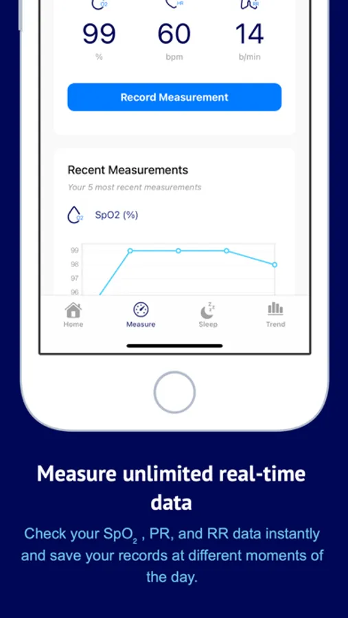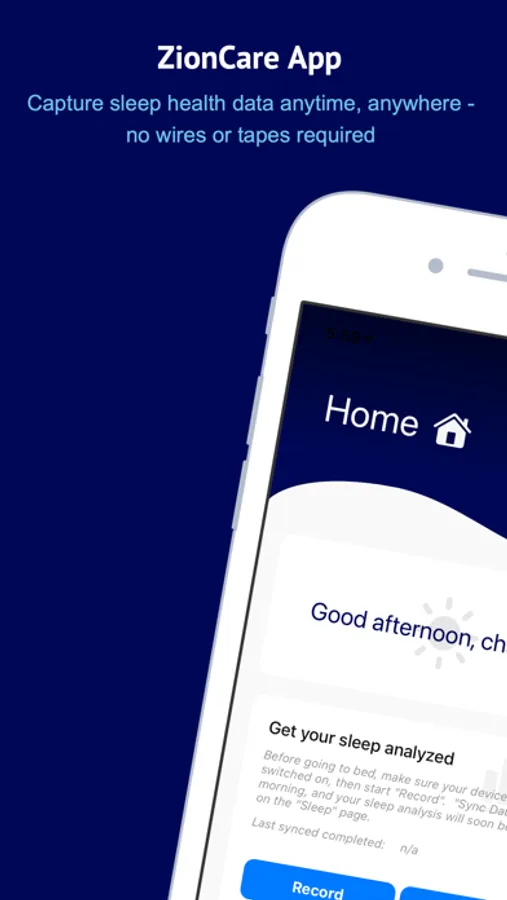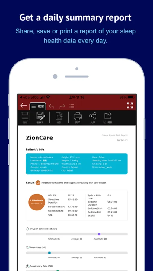 ZionCare App works with medical-grade wearable pulse oximeters, which collect PPG signal (Photoplethysmography - which is a light-based technology to sense the rate of blood flow) and converts it into Oxygen Saturation (SpO2), Pulse Rate (PR), and Respiratory Rate (RR) data. These data are used to calculate key indexes like ODI (Oxygen Desaturation Index) and T88 (percentage of cumulative time during sleep with oximetry below 88) to screen sleep-related hypoxia with lab-quality test results. This App is designed to make managing sleep health from home easier than ever, giving you the ability to record unlimited real-time SpO2, PR, and RR, share your sleeping reports with your doctor remotely, keep track of your record history, and more.