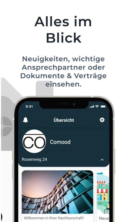 Die Comood App bietet eine Vielzahl komfortabler Features. Hier können Sie wichtige Unterlagen einsehen, ganz einfach eventuelle Schäden melden oder auf dem schwarzen Brett sehen, was es Neues gibt. Die App bietet auch eine übersichtliche Sammlung relevanter Informationen und wichtiger Kontaktdaten, wie z.B. Hausmeister:in oder Reinigungsservice. Zudem findet man hier Informationen über das hauseigene Restaurant und nützliche Tipps fürs Erkunden der Umgebung. Wer möchte, kann die App auch zum Austausch mit seinen Nachbar:innen nutzen: einfach Profil erstellen und Anliegen posten.