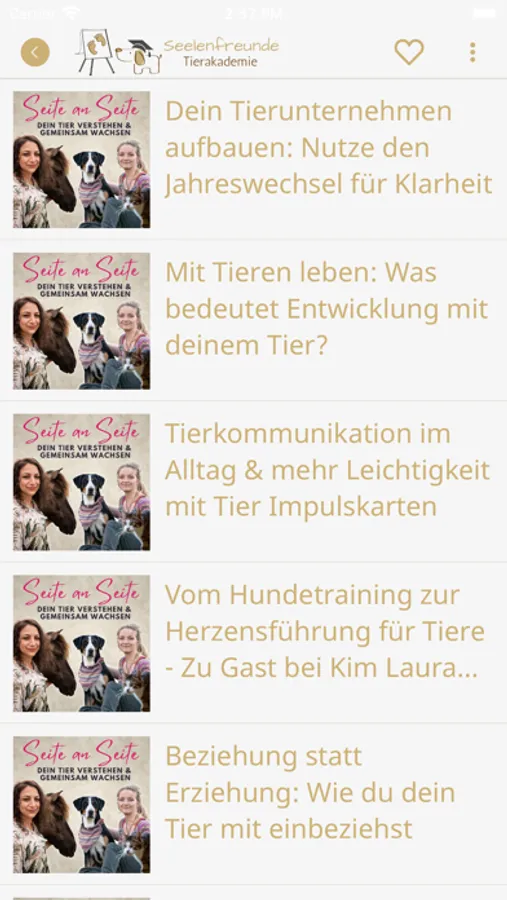Hier erwarten dich Tipps und Übungen von Tierkommunikatoren, Tierheilpraktikern, Tierärzten, Coaches für die Mensch-Tier Beziehung, Hundetrainern und Pferdetrainern sowie Tierbusiness Experten, mit deren Hilfe du die Verhaltensweise und die Bedürfnisse deines Tiers besser verstehst oder Tipps für die Selbstständigkeit im Tierberuf erhältst.