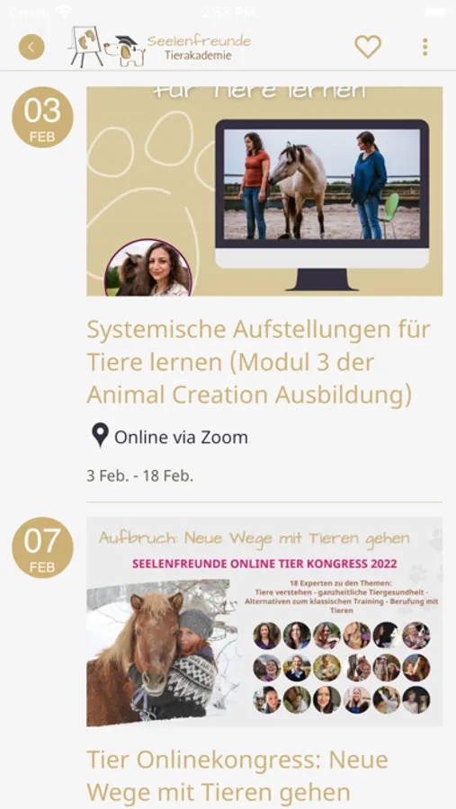 Außerdem findest du die neuesten Events aus der Seelenfreunde Tierakademie - deinem virtuellen Zuhause für eine vertrauensvolle Mensch-Tier Beziehung