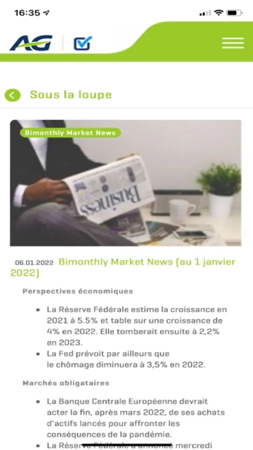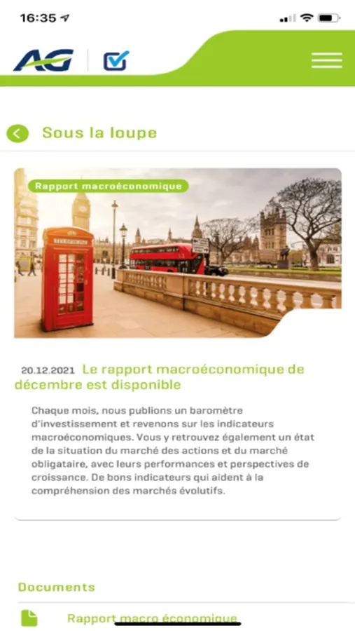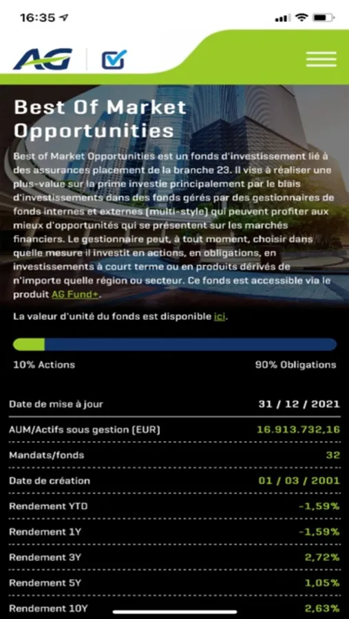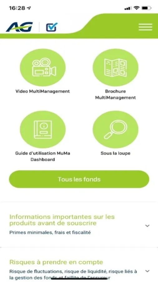 L’application AG MuMa Dashboard est un outil de reporting qui vous donne une vue détaillée de la gestion des fonds de placement proposés par AG dans les produits d’assurance vie individuelle (branche 23) et distribués par les courtiers. Vous y retrouvez des informations sur les gestionnaires de ces fonds et sur les marchés financiers, ainsi que les documents et performances des fonds. Cette application ne constitue pas un conseil en investissement. Découvrez également tout ce qu'il y a à savoir sur le MuMa Dashboard et la stratégie MultiManagement d’AG en consultant le guide d'utilisation, la brochure et la vidéo.