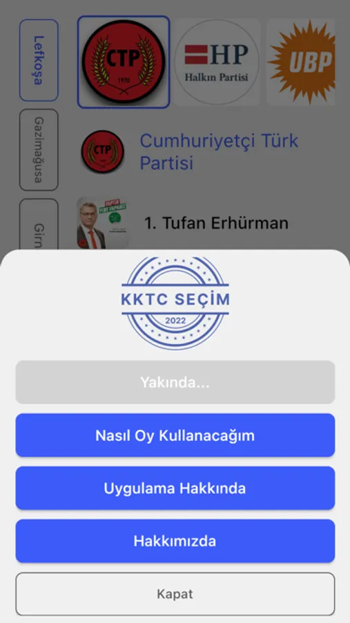 KKTC 2022 Genel Seçimleri için seçmenlere yardımcı olmayı ve bilgilendirmeyi amaçlayan kolay ve kullanışlı bir uygulama geliştirdik. Bu uygulama sayesinde, seçimde yer alan 8 ayrı parti ve toplam 403 adayın tamamını tek bir platformda görebilecek, oy vermeden önce haklarında bilgi sahibi olacak ve oyunuzu ona göre kullanabileceksiniz.