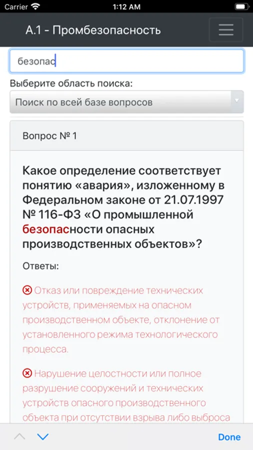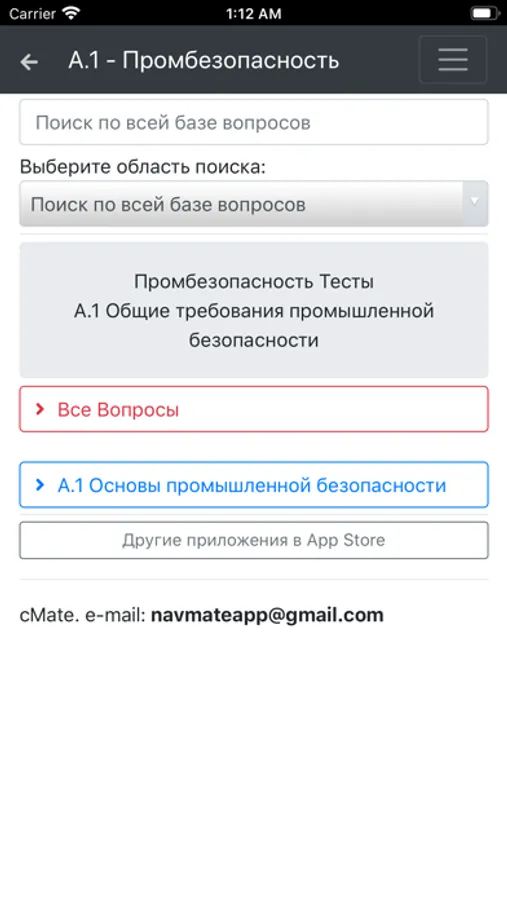 Приложение оснащено удобным поиском по всей базе вопросов или отдельной теме.