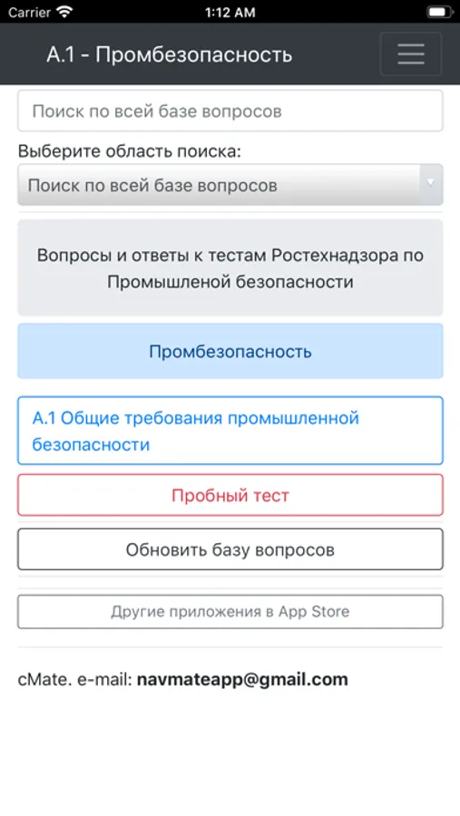 Приложение содержит полную базу вопросов и ответов с возможностью пройти пробный тест.