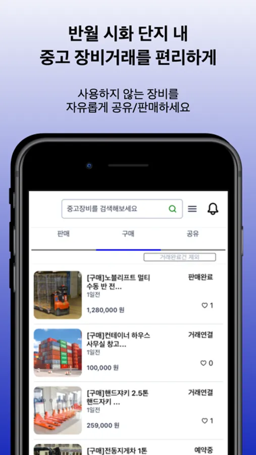 중고거래 판매 / 구매 / 공유(시간 당 공유)기능으로 원하는 장비를 찾을수 있습니다.