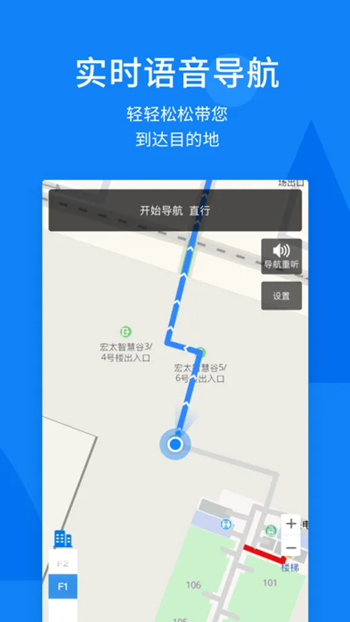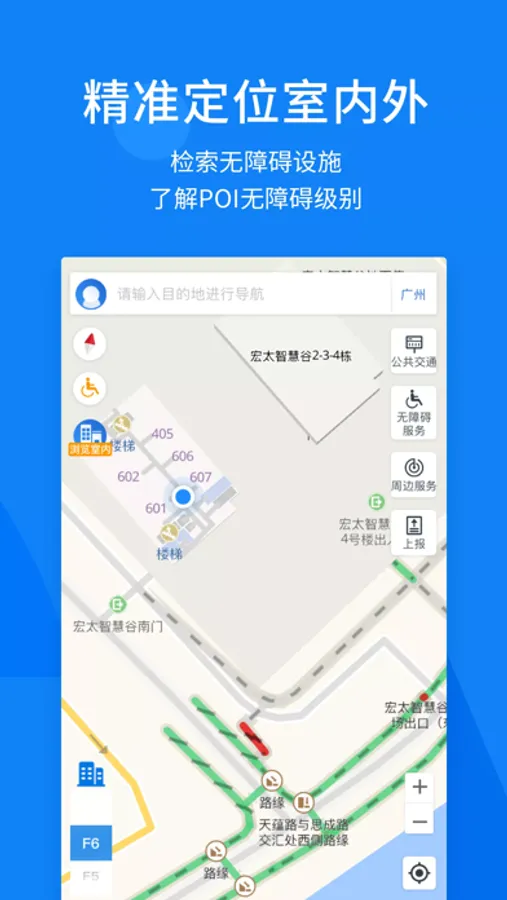 1、室内外定位,概览周边的无障碍路网及无障碍设施分布;
