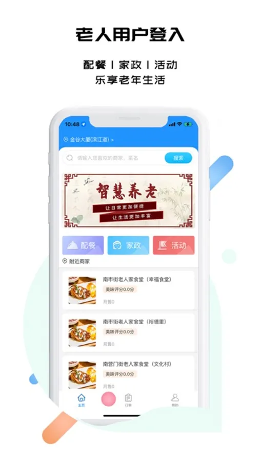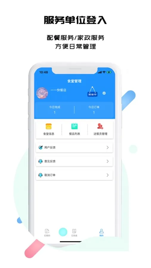 2.“我是服务单位”角色是为服务商提供的功能模块,服务商可以在这个功能模块接收到老人用户的预约订单,并进行处理。以及管理商户信息的功能。