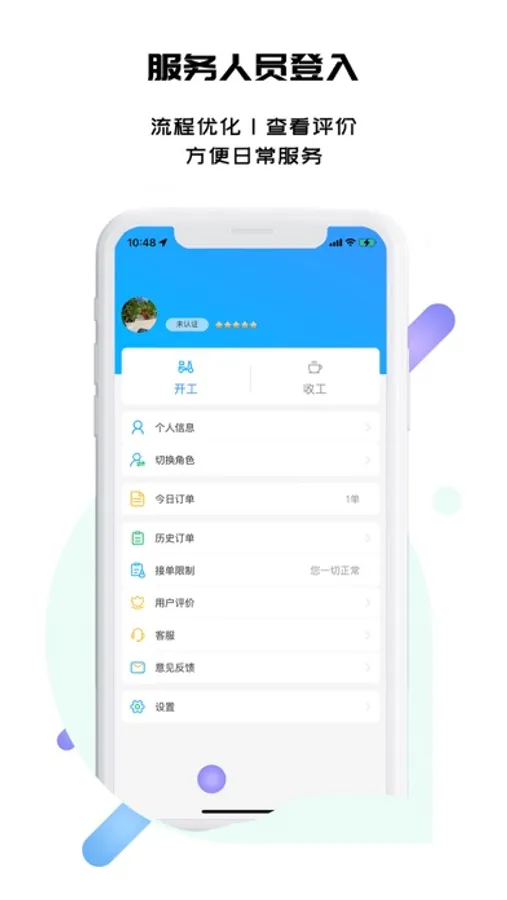 3.“我是服务人员”角色是给服务人员提供的版块,可以用此app进行相应订单的服务记录,以及修改订单的状态。
