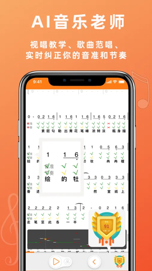 练声和视唱教学、歌曲范唱、根据你的演唱实时纠正你的音准和节奏