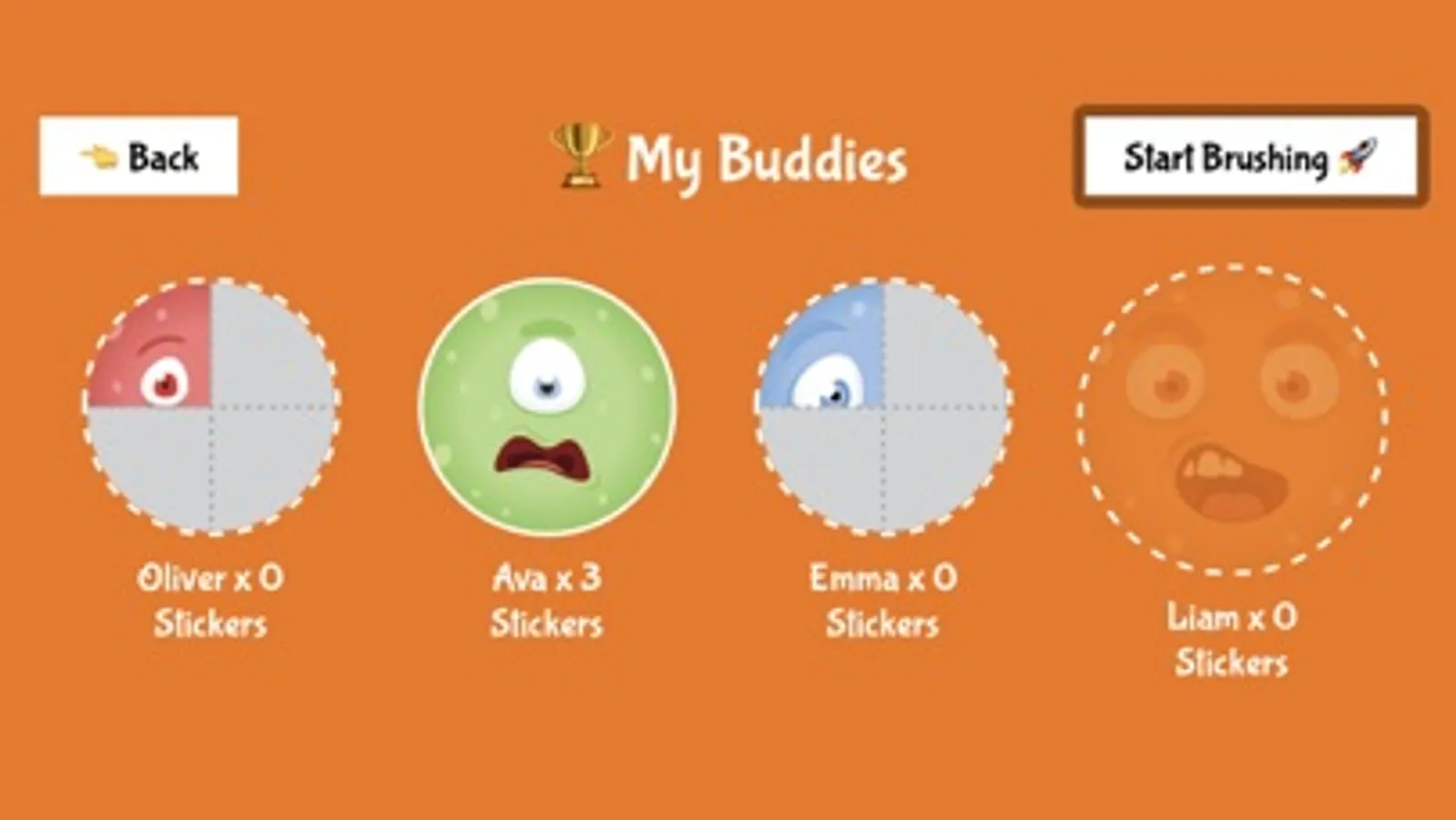 Every time you brush you can choose a “Buddy” with his or her own unique personality and song playlist to help you have fun while brushing. And every time you brush you can collect a piece of your buddy. Collect all four pieces to complete your buddy and trade it in for a sticker.