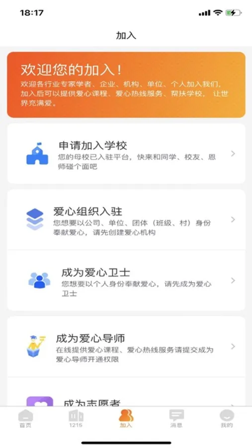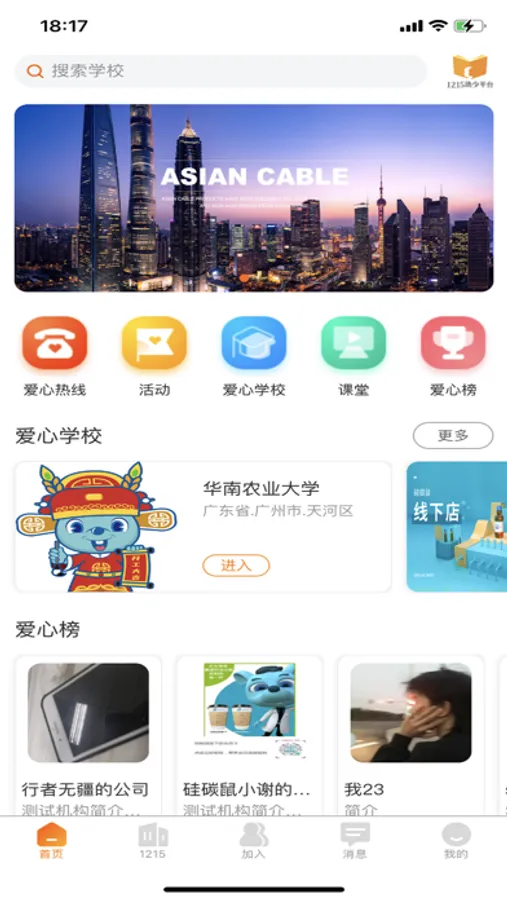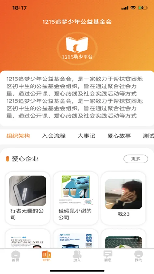 1215公益平台,是面向12-15岁之间乡村青少年的教育关爱平台,旨在通过社会机构的连接性、开放性和公益性等特点,整合爱心机构、爱心人士和教育专家等社会资源,帮助农村学校的青少年健康成长,帮助他们家长降低家庭负担及掌握教育孩子的正确知识和技巧,也通过和当地的教育主管机构合作帮助当地学校改善教育设施和提高教学质量。1215少年公益平台,和社会上的爱心机构、爱心人士及教育专家等合作,免费开设了类似爱心热线、公开课、校园话题、校园活动和教育政策等精彩有趣的教育内容和服务,帮助比较贫困的乡村学校的学生和他们的家长获得更好的教育资源和社会帮扶。1215少年公益平台,倡导的“使命”是帮助乡村青少年树立远大梦想,倡导的“价值观”是求实、创新和奉献,倡导的“愿景”是成为帮助乡村青少年健康成长的公益性组织。和乡村青少年一起成长,让社会更关注这些孩子们的德智体全面发展,这就是1215少年公益平台为此一直在努力的伟大事业。