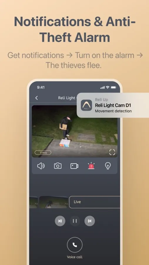 Receive instant notification when someone, vehicles passes by or a package being left. Trigger the siren through the App, and the light will flash at the same time.