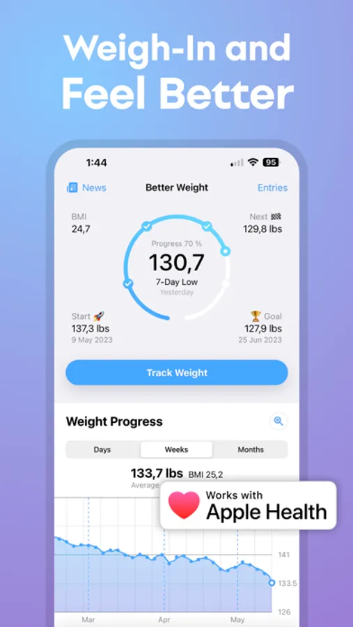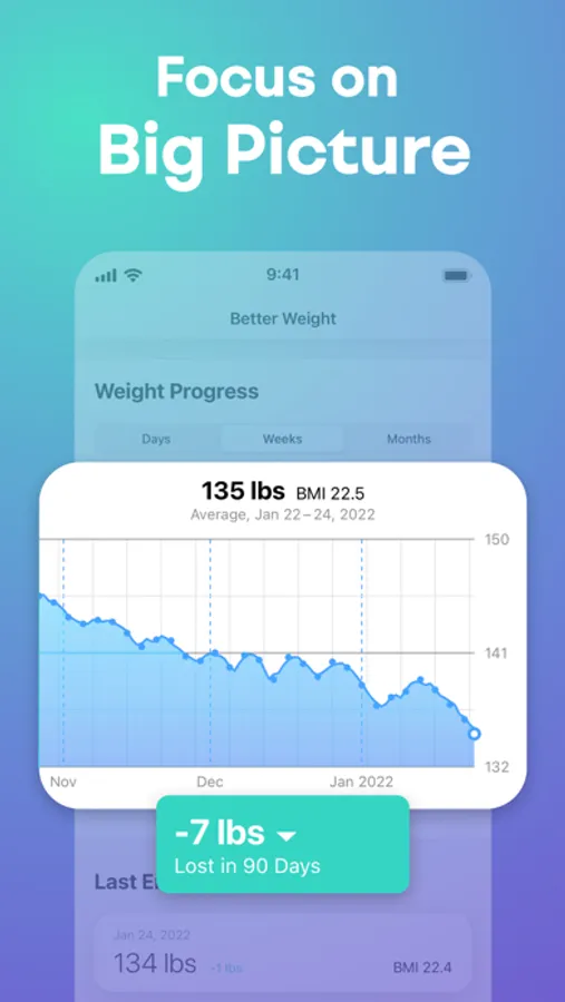 Better Weight app is here to make your journey motivational and more satisfying. We want to make it simple to track progress and motivate you every time you make a step in the right direction.