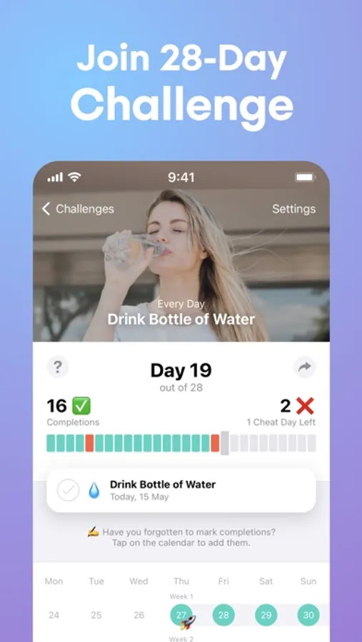 Pick from the curated list of 28-day challenges. Challenges are healthy habits that guide you along the way! It might be everyday exercise, stretching, drinking water, or eating healthy. It's up to you to pick the ideal habit and set the difficulty.