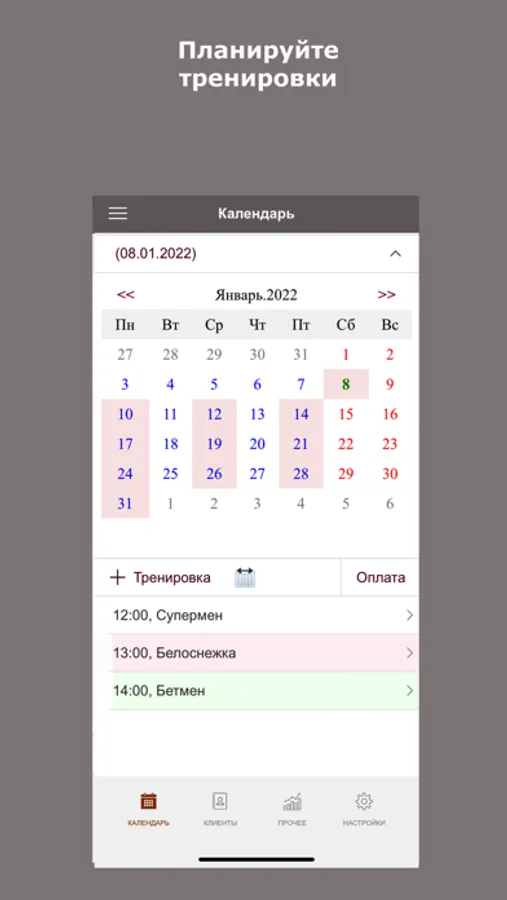 - Вести фиксацию тренировок и оплаты от клиентов, как групповых так и индивидуальных;