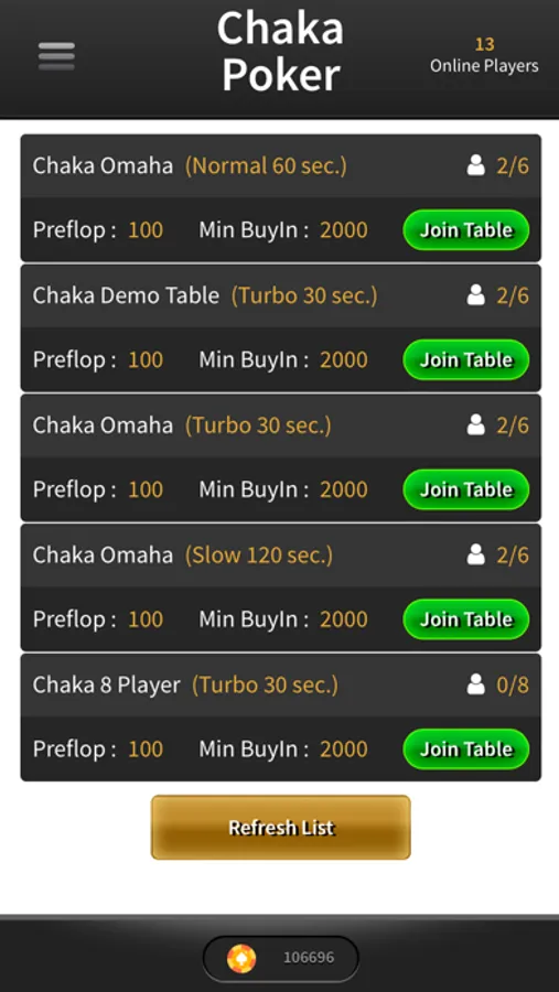 Chaka poker is similar to Omaha Poker, but with some differences. Each player is dealt four cards face down, and five community cards. As in Omaha poker, the players must choose two of their four cards and use both of them to make the best hand possible. In Chaka poker, the preflop amount is predetermined, and it is a non-optional bet (like the blinds in Omaha poker). There is no option to raise or fold in the preflop phase. After the preflop bets have been collected from players, each player is dealt four cards face down; at the same time, three community cards are dealt. At this phase, the players have the option to place a bet or fold. After the bets are placed, the turn and the river cards are dealt and the winner is determined. There is no option to bet on the turn and river cards.