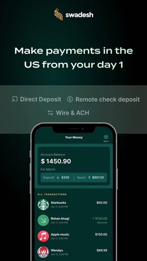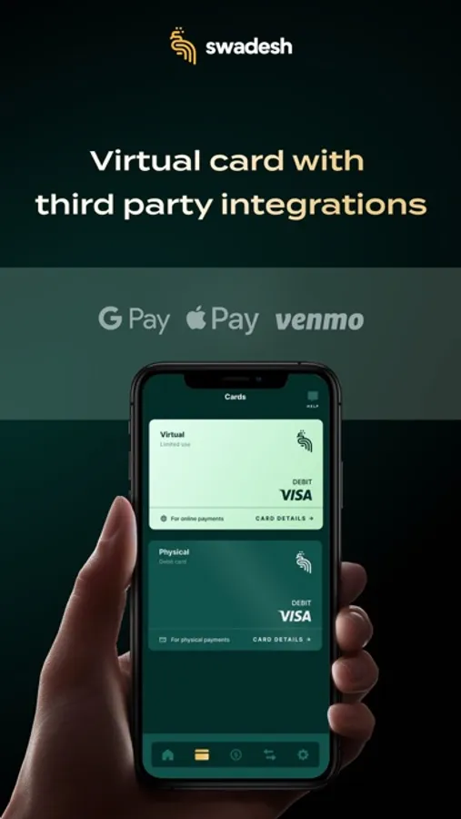 Receive a Swadesh/VISA virtual debit card instantly with your U.S. bank account, ready to use immediately for online & contactless payments at all participating U.S. retailers! Use your virtual card for important online purchases even before you land in the U.S., and enable single-tap contactless payments on the card after you have landed in the U.S.