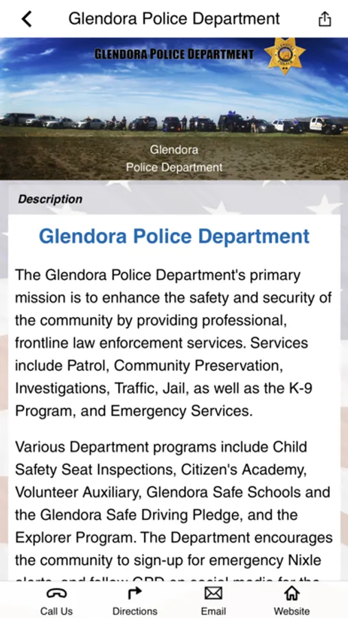 On behalf of the men and women of the Glendora Police Department, welcome to our app. This app is for the employees and family members of the Glendora Police Department as well as the community it serves. It contains information about our department as well as safety and crime prevention tips. Glendora Police Department employees will have access to a full range of wellness tools.
