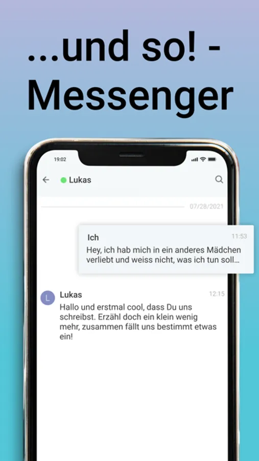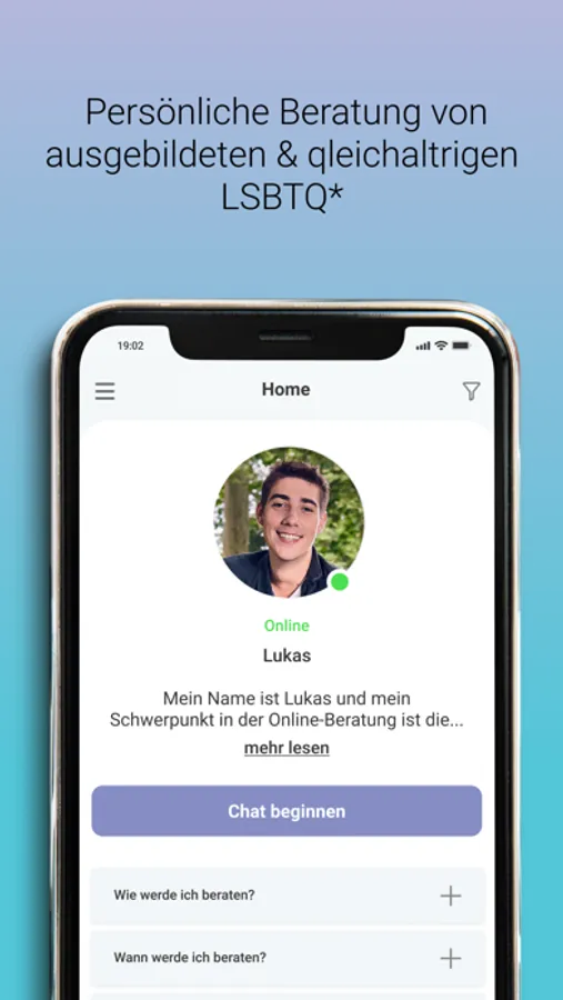 Wir sind ehrenamtliche Peer-Berater:innen (also Jugendliche/junge Erwachsene beraten Jugendliche/junge Erwachsene), sind alle selber LSBTQ* und sind durch ein professionelles Team an Psycholog:innen und Sozialpädagog:innen ausgebildet und begleitet. Also: schreib uns, wir freuen uns auf dich! Achja, wenn du gerade nicht so richtig weißt, wie du deine Message an uns anfangen sollst: das geht uns allen manchmal so! Schreib einfach ein kurzes "Hi!" oder ein bisschen etwas zu dir und was dir gerade durch den Kopf geht, den Rest kriegen wir dann gemeinsam schon hin! Mit dem „…und so!“ Messenger kannst du vollkommen anonym und einfach mit uns texten - genauso wie du es von anderen Messenger-Diensten her kennst. Du suchst dir deine:n Ansprechpartner:in* aus und schon sind wir in Kontakt! „…und so!“ ist Deutschlandweit die einzige queere Messenger-App. Nutze unser vielseitiges Angebot, lade dir jetzt die App runter und log dich einfach mit deinem Nickname ein. Schreib uns eine Message und wir werden dir zeitnah darauf antworten.