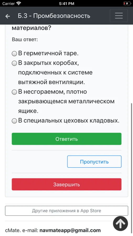 Приложение содержит полную базу вопросов и ответов с возможностью пройти пробный тест.