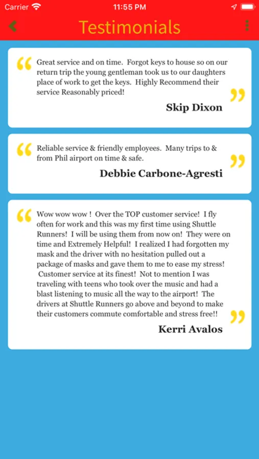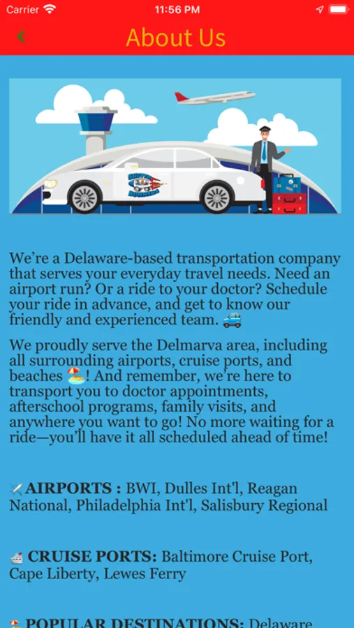 This app connects travelers in need of shuttle services to and from airports for the Delaware and Ocean City areas. The servicing airports are Baltimore Washington (BWI), Reagan National, Dulles Int'l, Philadelphia Int'l and Salisbury Regional. Shuttle Runner's services are private to the purchasing party. Travelers in these regions use this app to prepare ahead for their vacation and/or appointments.