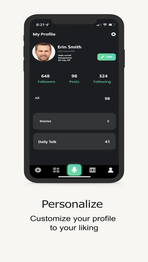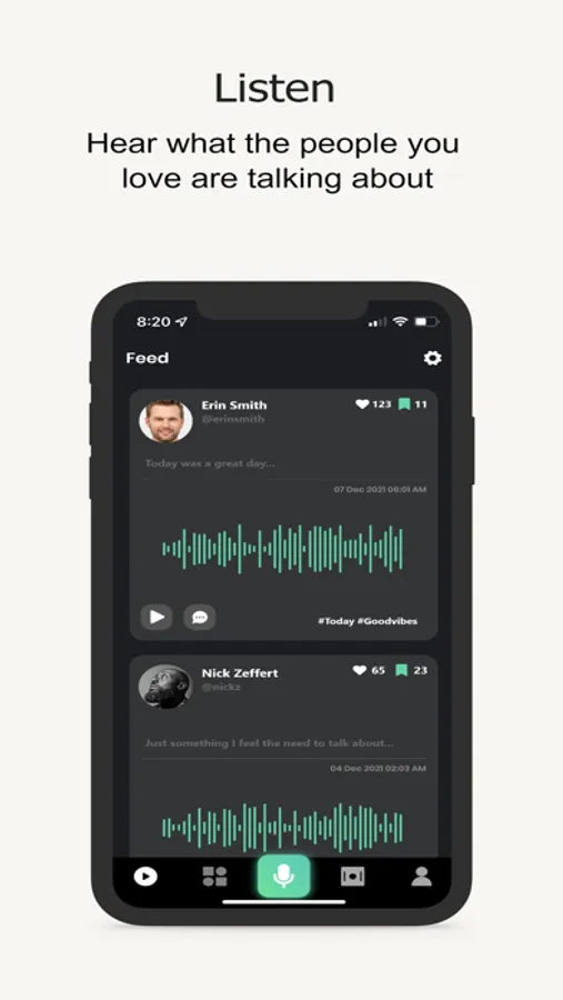 Follow who you love - the follower feed allows you to browse through audio clips that the people you follow have posted. Comments on posts are audio and text-based to encourage true, genuine conversation. You can save clips to the vault to forever come back to and like the posts on your feed to show your enjoyment.