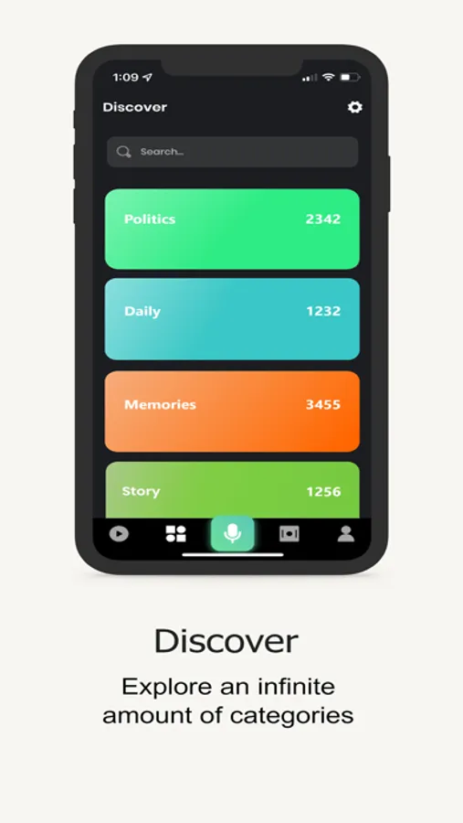 The discover page allows you to browse through an unlimited number of categories in a seamless way. Categories are created by users, so this allows for an environment of possibility, creativity, conversation, and more.