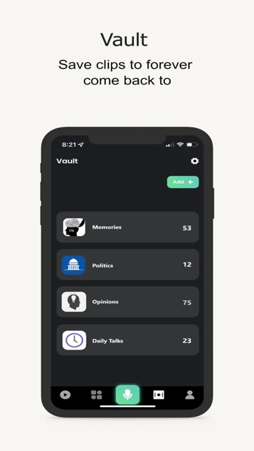 The Vault allows users to save posts and clips to forever come back to. You can save other users' posts, your own posts, and even clips that are just for yourself.