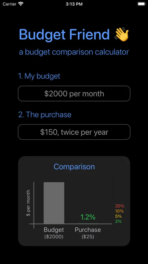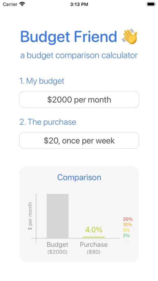 Budget Friend is a simple budget comparison calculator that helps you manage your purchases. Simply compare your next purchase to your target budget and get quick visual feedback.