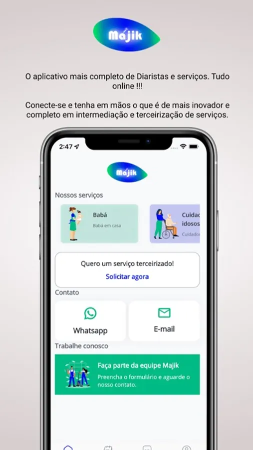 Clientes potenciais, Prestadores(as) autônomos(as), Profissionais terceirizados, seu lugar de encontro é aqui na Majik. A plataforma que vos une de maneira prática, rápida e otimizada.