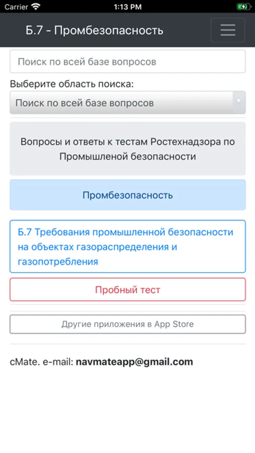 Приложение содержит полную базу вопросов и ответов с возможностью пройти пробный тест.