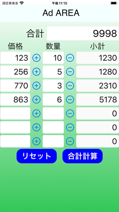 2.数量を+とーのボタンで変更すると小計と合計が計算される。