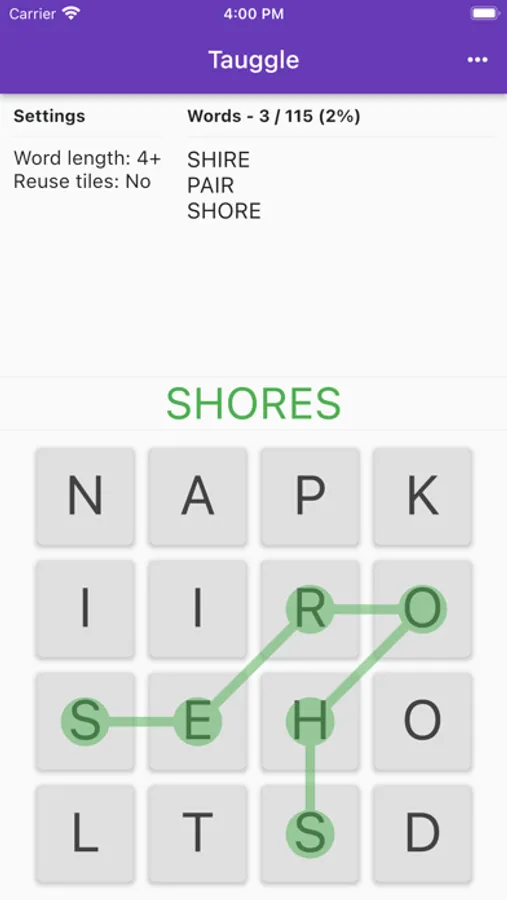 Tauggle is a word search game with always winnable, always interesting boards. Find words that follow twisting paths through a randomly generated board of letter tiles, with a wide variety of game modes.